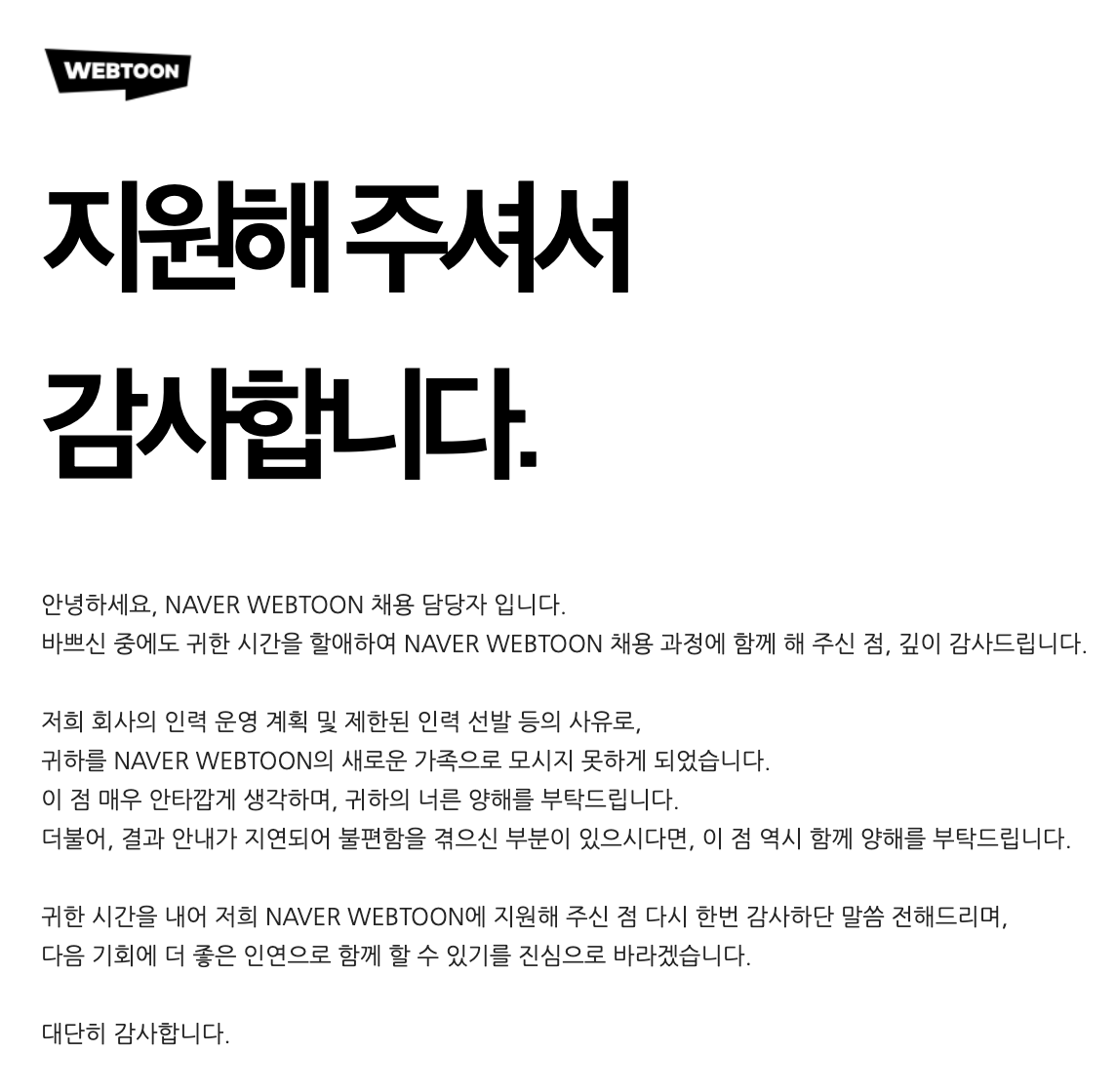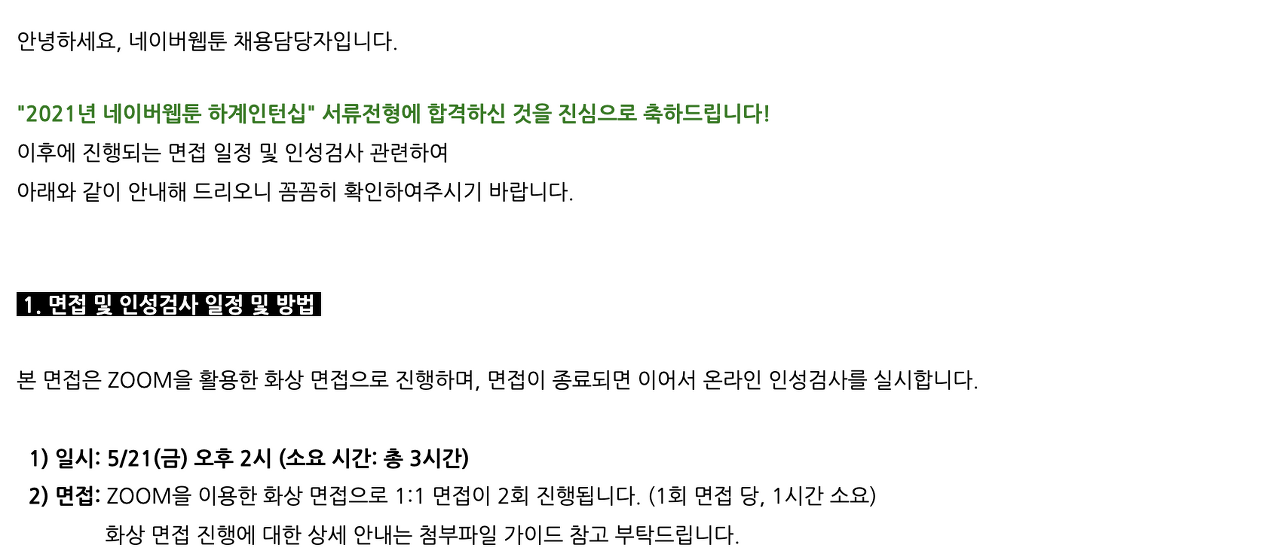 처음 서류 합격을 한 곳이 네이버 웹툰이라서 정말 기분이 좋았다. 그리고 면접 내용을 보고 놀랐다. 면접 2회에... 각 1시간씩 총 2시간...
